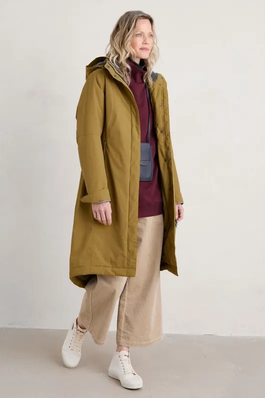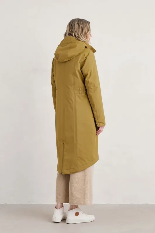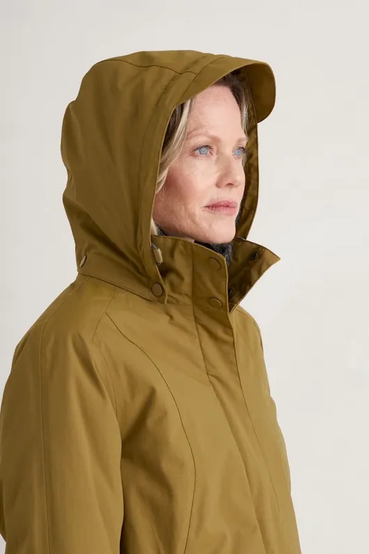 De Janelle Winterjas zit boordevol technische kenmerken en is gemaakt om lang mee te gaan. Het is een knielange winterjas gemaakt met een buitenzijde van gerecycled nylon Tide Cycle®. Het is ontworpen om het slechtste weer van Cornwall te weerstaan, met ruimte voor verschillende kledinglagen eronder. De bovenste helft is gevoerd met behaaglijke ton-sur-ton fleece, terwijl de onderste helft is gewatteerd voor warmte en bewegingsvrijheid. We hebben een klep toegevoegd aan de afneembare capuchon om je gezicht te beschermen tegen wind en regen, en er zitten reflecterende strips op de achterkant van de capuchon en de onderkant van de mouwen om je beter zichtbaar te maken in het donker.
