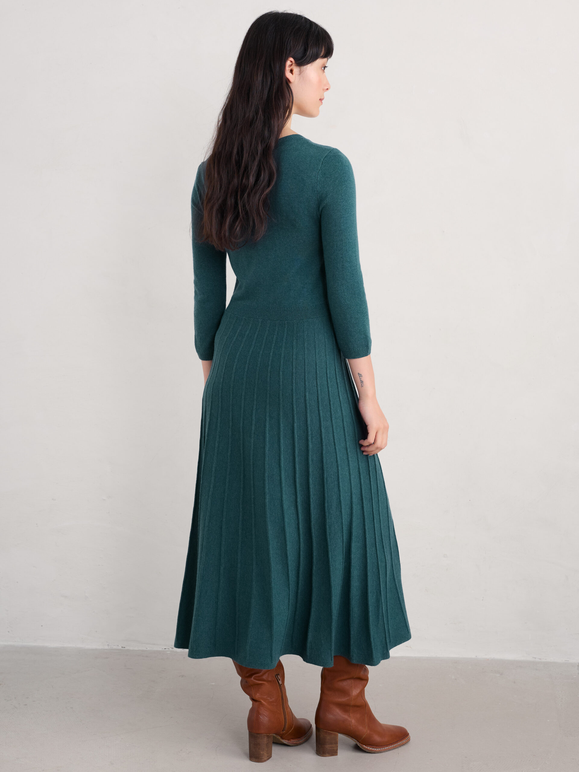 Gebreid van een zachte mix met verantwoord gewonnen wol en gerecyclede vezels, laat deze eenvoudige maar verfijnde stijl mooie details centraal staan. Met een zwierige rok met ribdetail en puntjes op het lijfje zijn de rijke, winterse kleuren perfect voor zowel nette als casual gelegenheden.