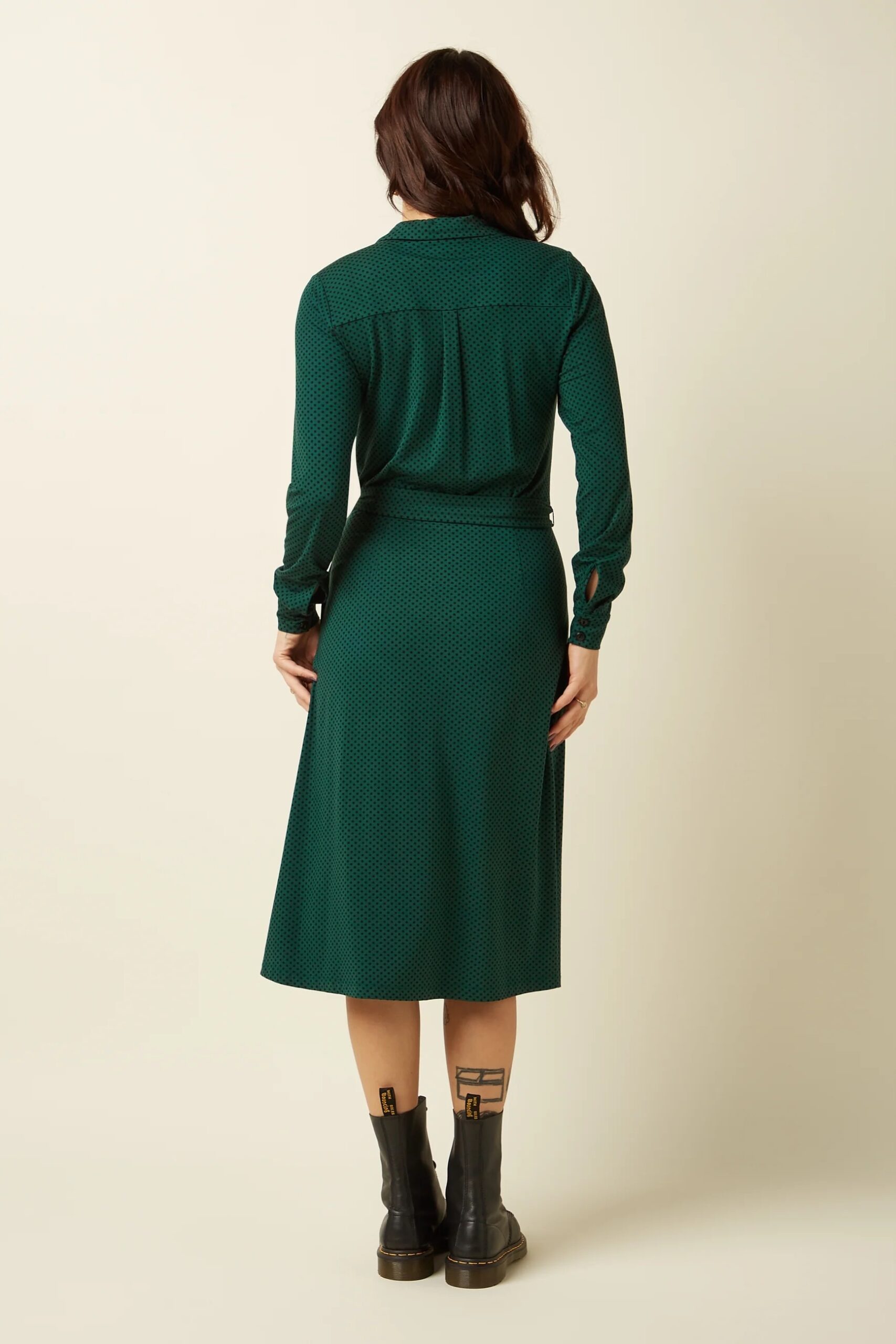 Deze midi-lange Lola Dress Piper heeft een uitlopende pasvorm, gemaakt van rekbare viscosejersey. Met ceintuur, klassiek polkadotpatroon, lange mouwen, een reverskraag en knoopsluiting voor een verfijnde afwerking.
